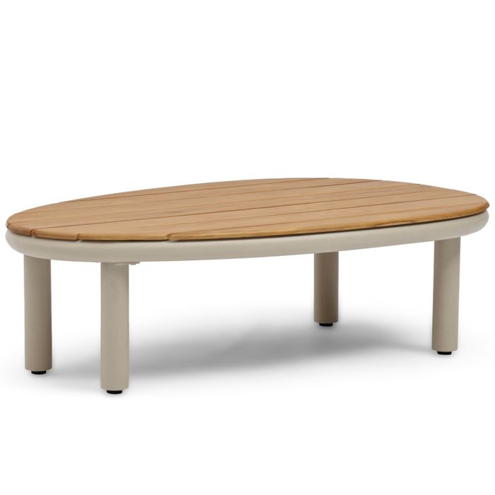 Het teakhouten blad vormt een warm contrast met het aluminium frame in de kleur loft (zandkleur). Deze combinatie van natuurlijke materialen en moderne lijnen maakt de Almara tot een echte blikvanger op ieder terras.