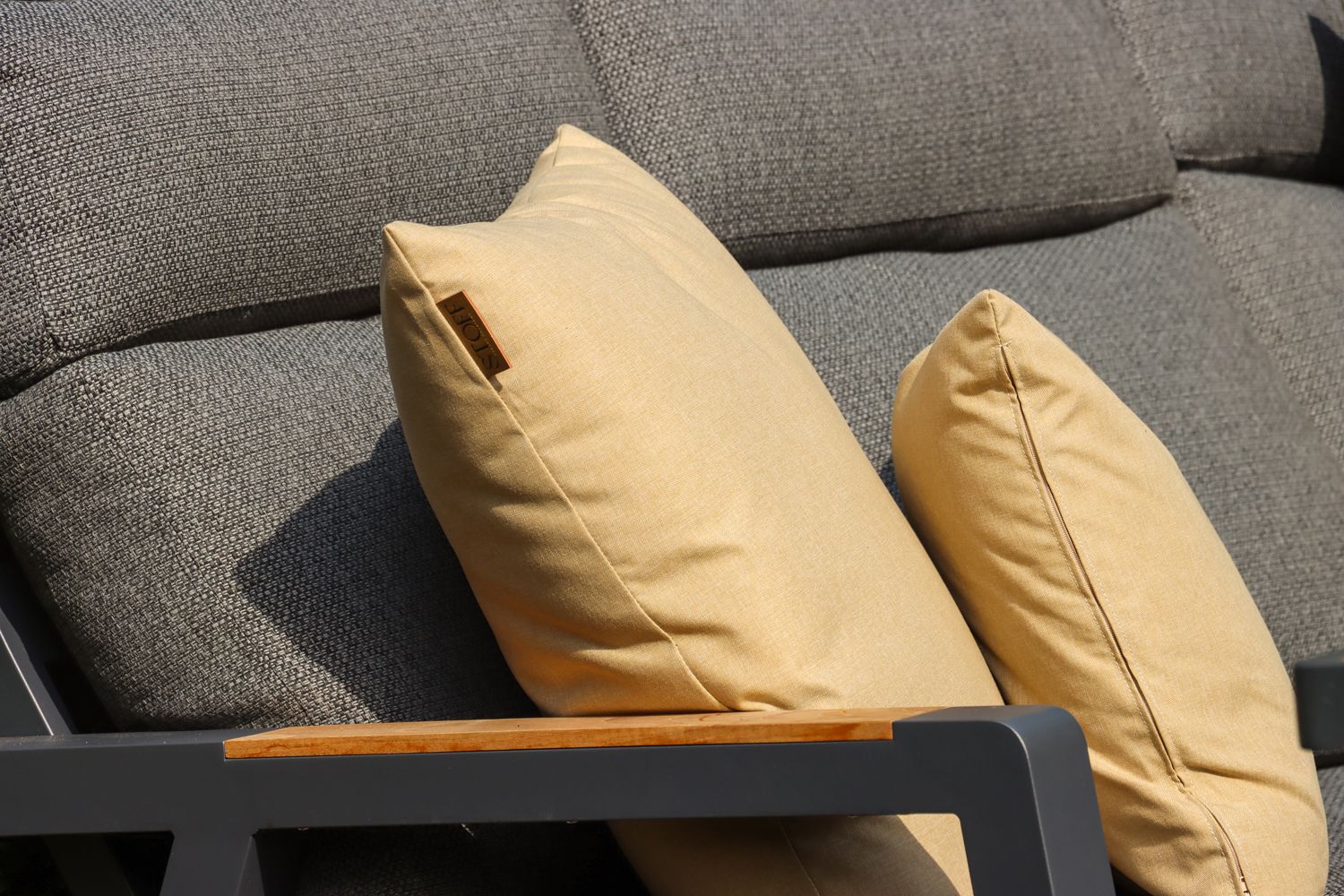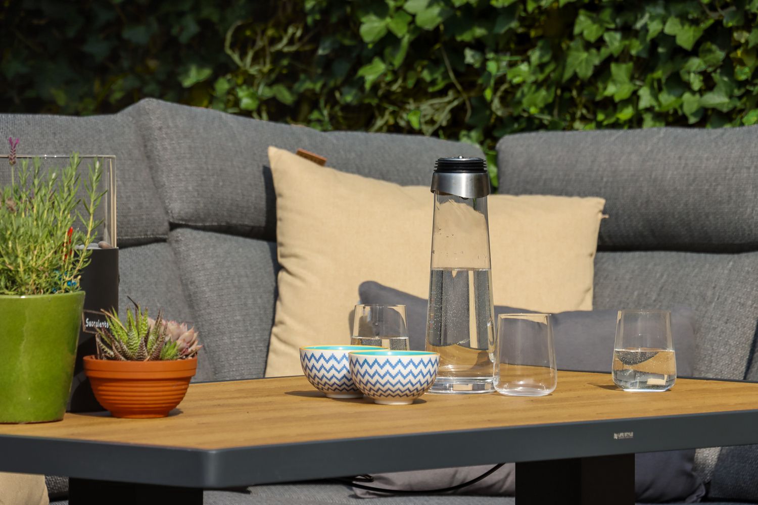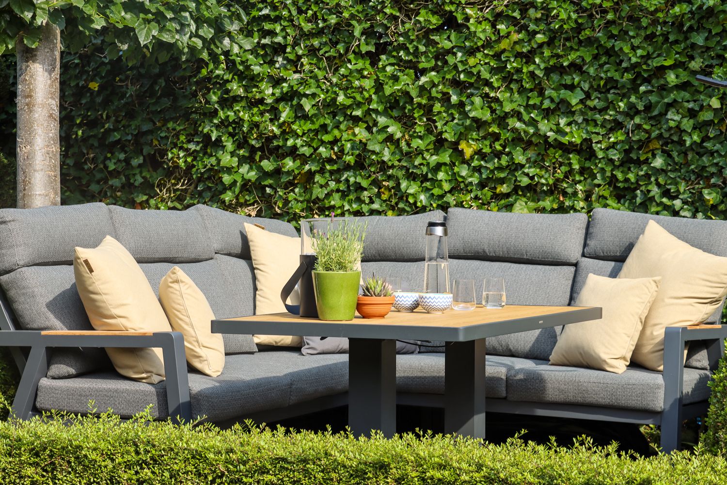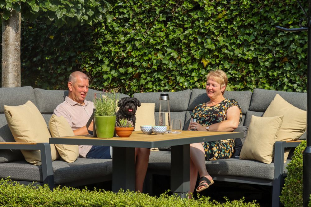 Het wensenlijstje was helder: een hoek-loungeset waar je zowel op kunt loungen als samen aan kunt eten. De maat bleek doorslaggevend. “Ja, eerst online, gezocht op de afmetingen. En ja, goed, dan valt er al heel veel af,” legt Helga uit. De set moest precies passen op het betegelde vlak, want de tuin veranderen was geen optie. Andere aanbieders vielen af: “Niks. Dus toen kwamen we eigenlijk bij Tuinmeubelshop uit.”